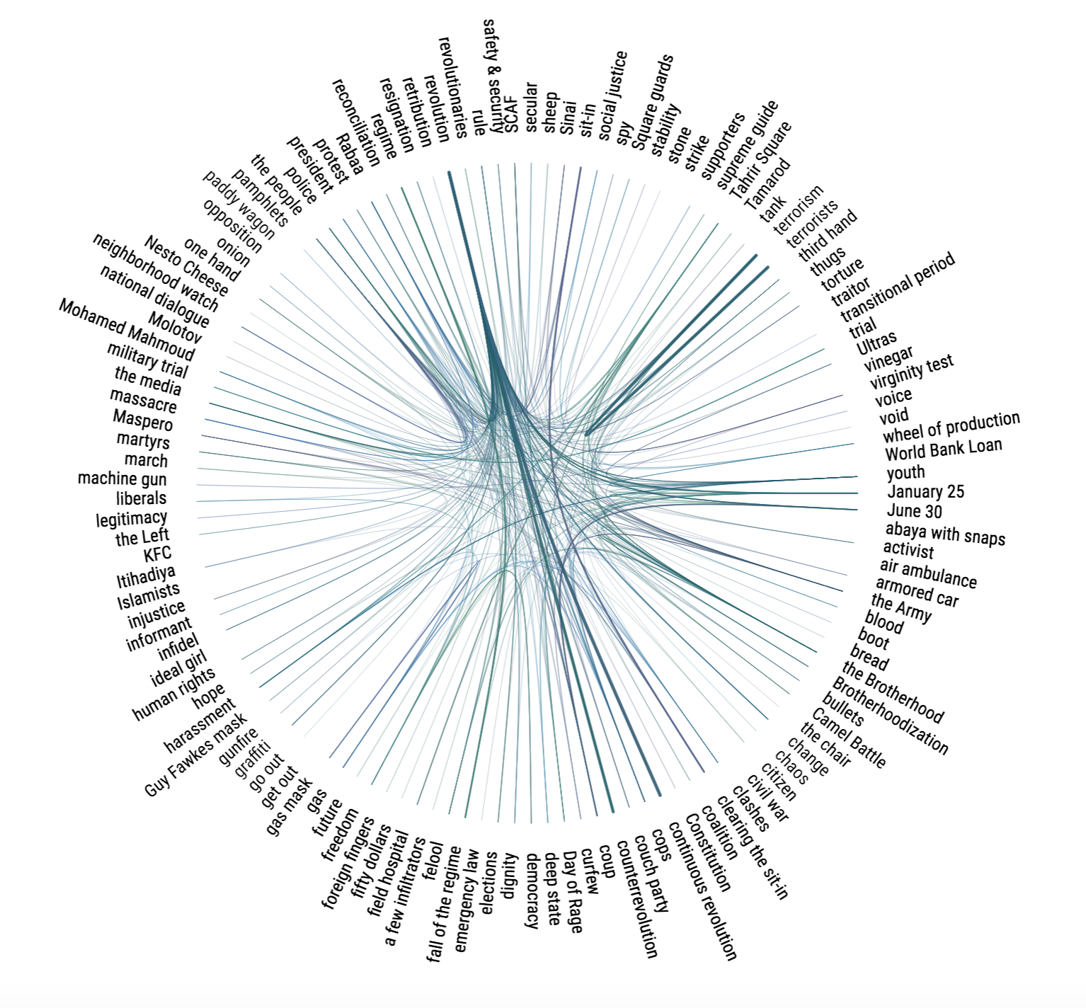 The above image is a screenshot showing the Arc Diagram structure, linking the words in the “Dictionary of the Revolution”. As you move the cursor over the words in the circle, lines show up between the words that are in direct reference to each other. If you click on a word you are taken to a “definition” for that word, which in reality is a text, an account in relation to the 2011 events in Tahrir Square. It is those texts that define the reference relations between the words. Just as Pablo’s Gephi map had the Wikipedia pages to define the links between terms, Amira has her own set of (inter-related) texts that define the inter- relationships between the words.