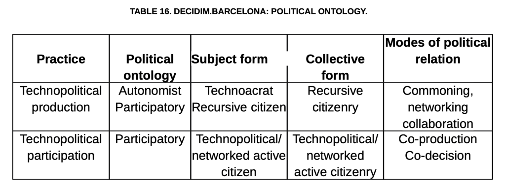Image 4. Table on Decidim.Barcelona’s political ontology. From Since 15M: the technopolitical reassembling of democracy in Spain