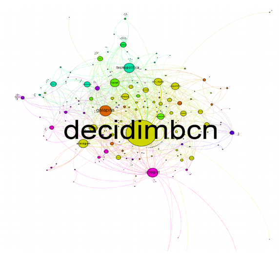 Visualising ideas. Network and map style images proliferate in representations of the Decidim ecosystem and genealogy, as seen above in Images 1-3 and also in the beautiful Gephi images produced across the international Tecnopolítica community. This Gephi (or Gephi style) visualisation created by Arnau Monterde (a key Tecnopolitica researcher-activist) shows Retweet networks produced by a 2016 MetaDecidim event (MetaDecidim is the community and governing body of Decidim):