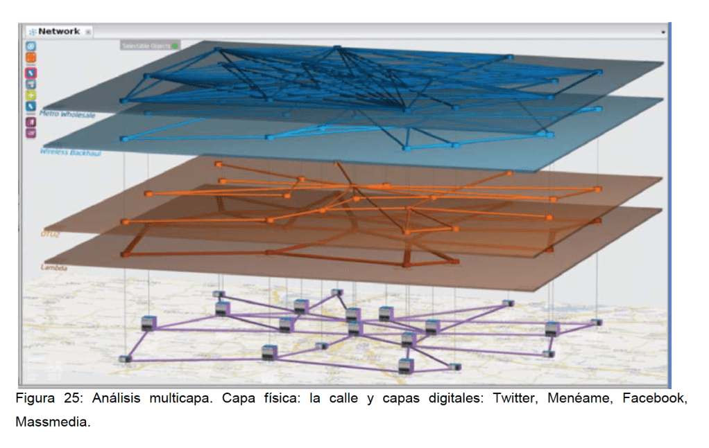 Image 4. Title Translation: Multilayer analysis. Physical layer: the street and Digital layer: Twitter, Menéame, Facebook, Massmedia, in Tecnopolítica: la potencia de las multitudes conectadas. El sistema red 15M, un nuevo paradigma de la política distribuida. [Technopolitics: the potential of connected multitudes. The 15M network system as a new paradigm of distributed politics.] (Toret et al, 2013, p. 110).