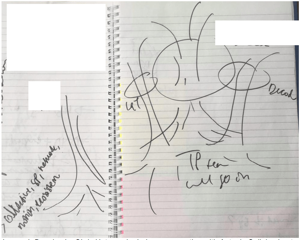 Image 8. Drawing by Chris Hotz made during conversation with Antonio Calleja-López about Tecnopolitica, Decidim and how they relate together (July 2018).