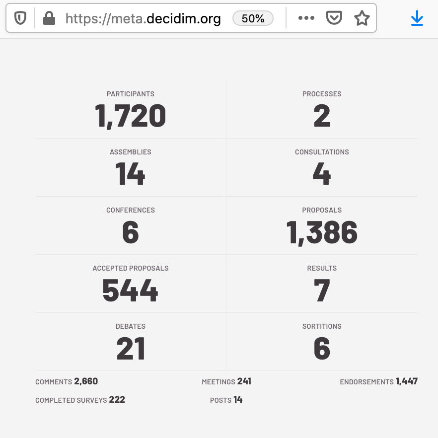 The social contract shows commitments to free software, open content, equality and responsibility – reflecting Decidim’s roots in hacker and politically savvy communities. As an open source code, the Decidim code and its development process are freely accessible on Github, which is a kind of online library of successive versions of open source code. Participatory processes and assemblies take place openly on on the Decidim sites and content remains viewable there. Furthermore, a commitment to Open Access data allows direct live overviews into what’s going on, such as live data available on Decidim homepages (see below), the aforementioned Decidim Monitor, and at the bottom of each Decidim website you can click and download vast xcel sheets of Open Data for each site.