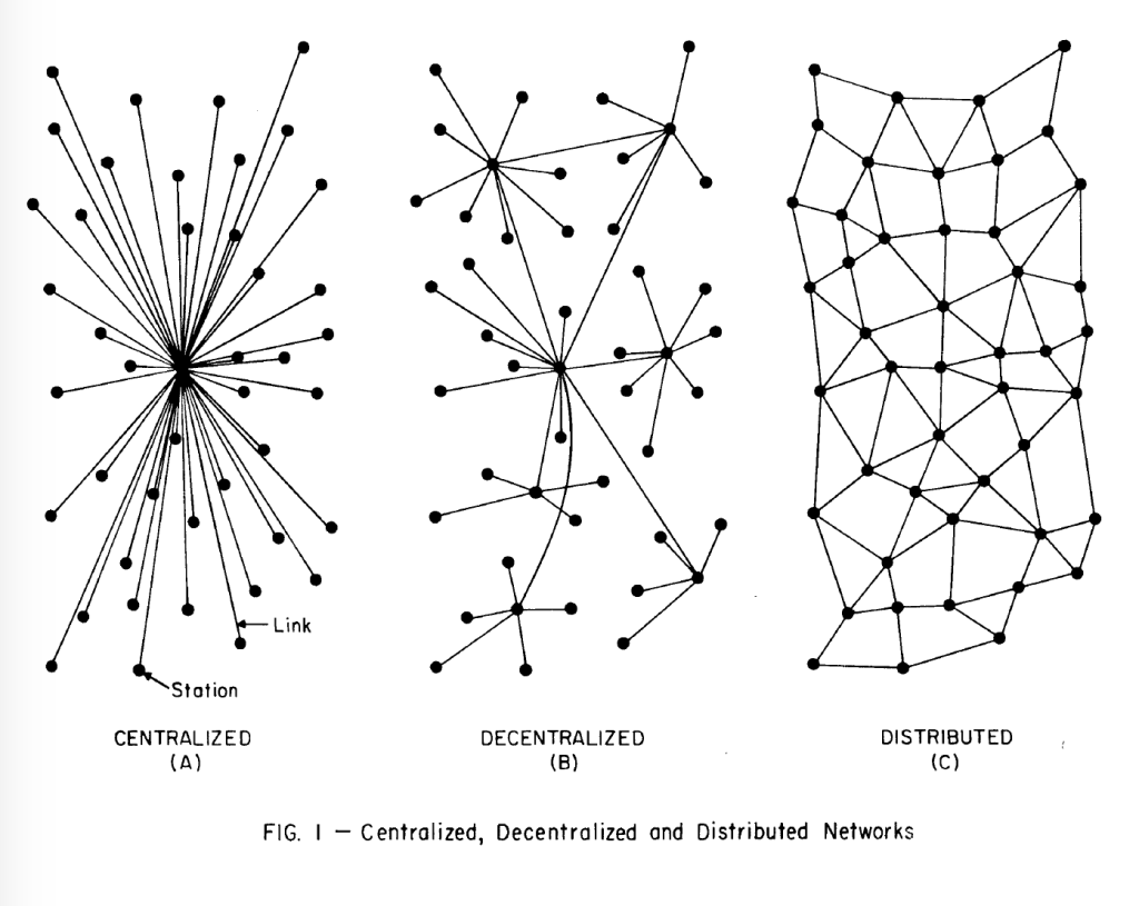 Baran’s network typologies from the early days of computing (1964) are still referenced by Tecnopolitica researcher-activists at the forefront of social transformation today (see diagram below). Decentralized and distributed networks, politics and technologies are at the heart of Tecnopolitical practices, however their politics are far removed from Baran’s context of US Air Force funded research. Politically, Tecnopolitica would have more in common with the trajectory of bell hooks whose framework: emphasises ‘the centre’ (contrasted with the margin); suggests ‘the decentering of the West globally’ and a focus instead on ‘attention on the issue of voice. Who speaks? Who listens? And why?’ (p. 40, 1994); and continues to be a reference point today for people arguing for ‘decentering and decolonising knowledge’ (Moreno Figueroa, 2019).
